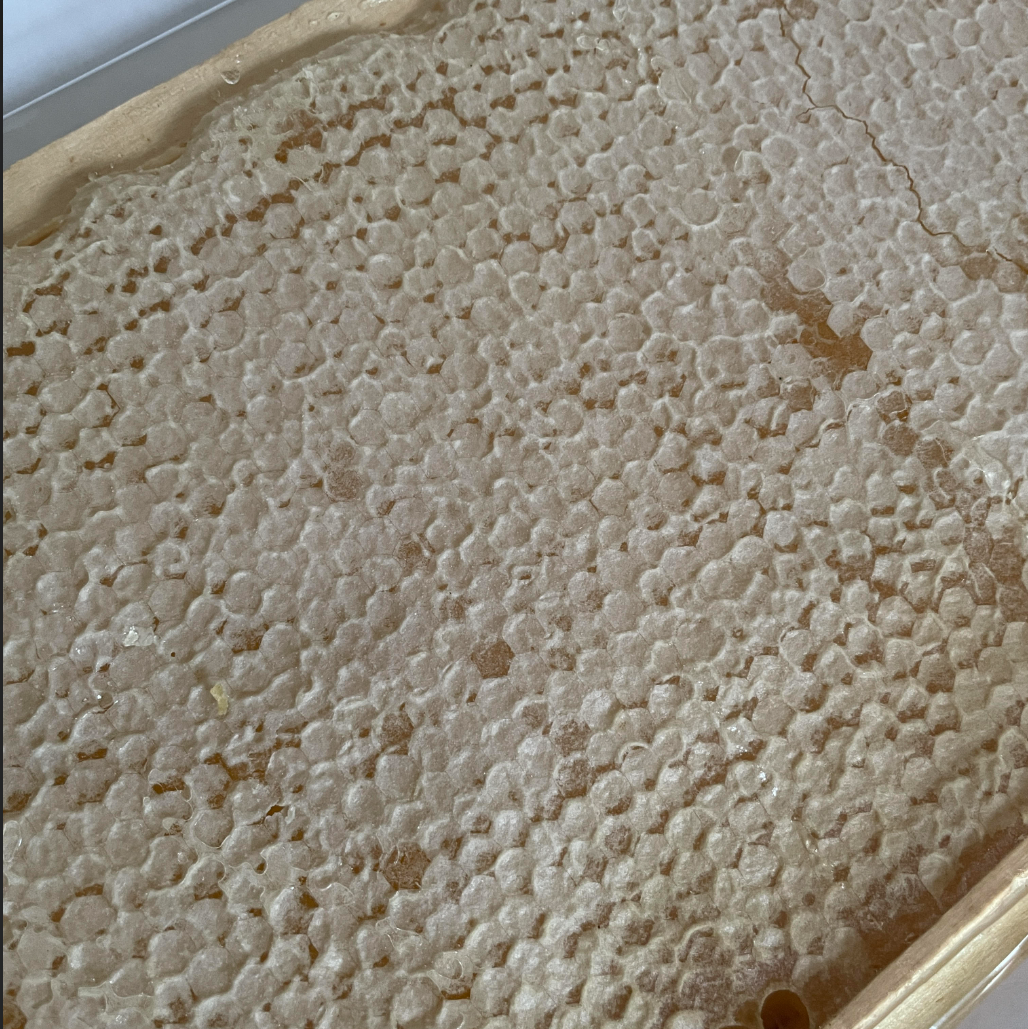 De honing is van nature vloeibaar en wordt gecombineerd met de eetbare bijenwas van de raat. Dit geeft een unieke structuur: zacht en stroperig met een lichte bite van de was.
